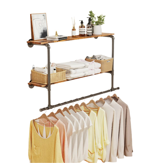Industrial Pipe Clothing Rack – Wall-Mounted Wood Shelf And Floating Display