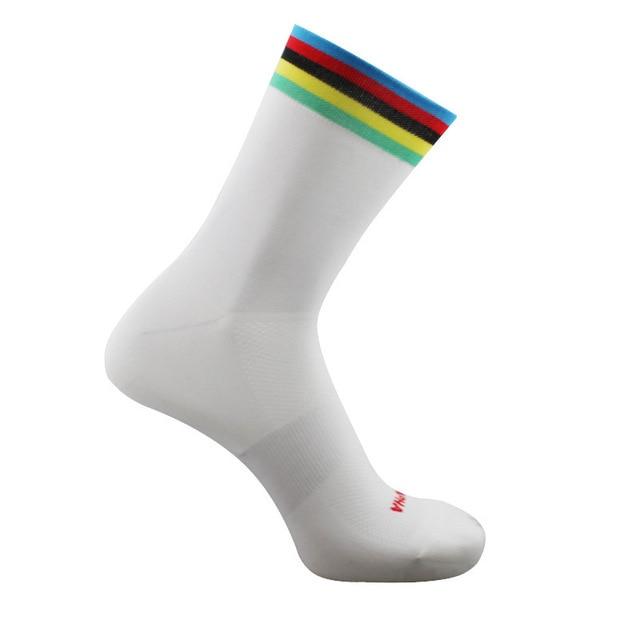 UCI Rainbow Socks is a newly developed yarn that we have created to build on our very popular mercerized Merino winter cycling socks. The socks make use of Cashmere & Silk to add to its heat regulating properties and luxurious feel when on.
