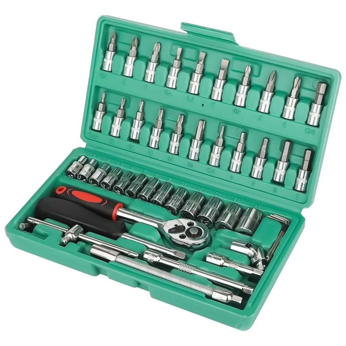 Complete 46 pieces – Includes sockets, bits, and extensions.