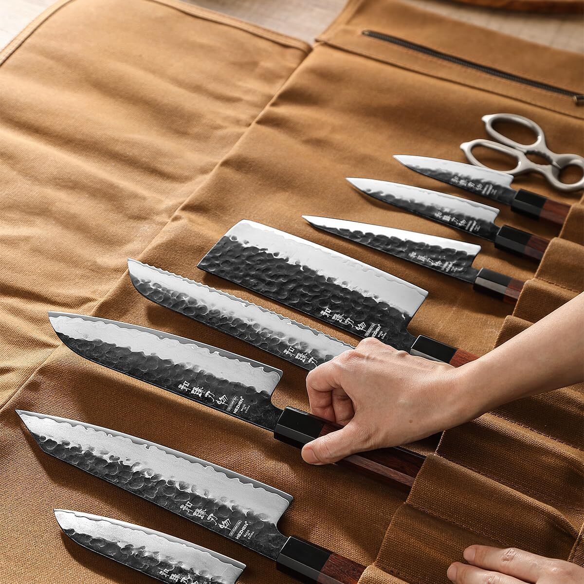 Designed with human-centred ergonomics, the adjustable leather strap extends up to 140cm, allowing comfortable shoulder or crossbody carry. The secure roll-up structure prevents internal shifting, even when fully loaded. Whether commuting to a restaurant, attending culinary school, catering events, or cooking outdoors, this knife bag ensures safe transport without compromising comfort or balance.