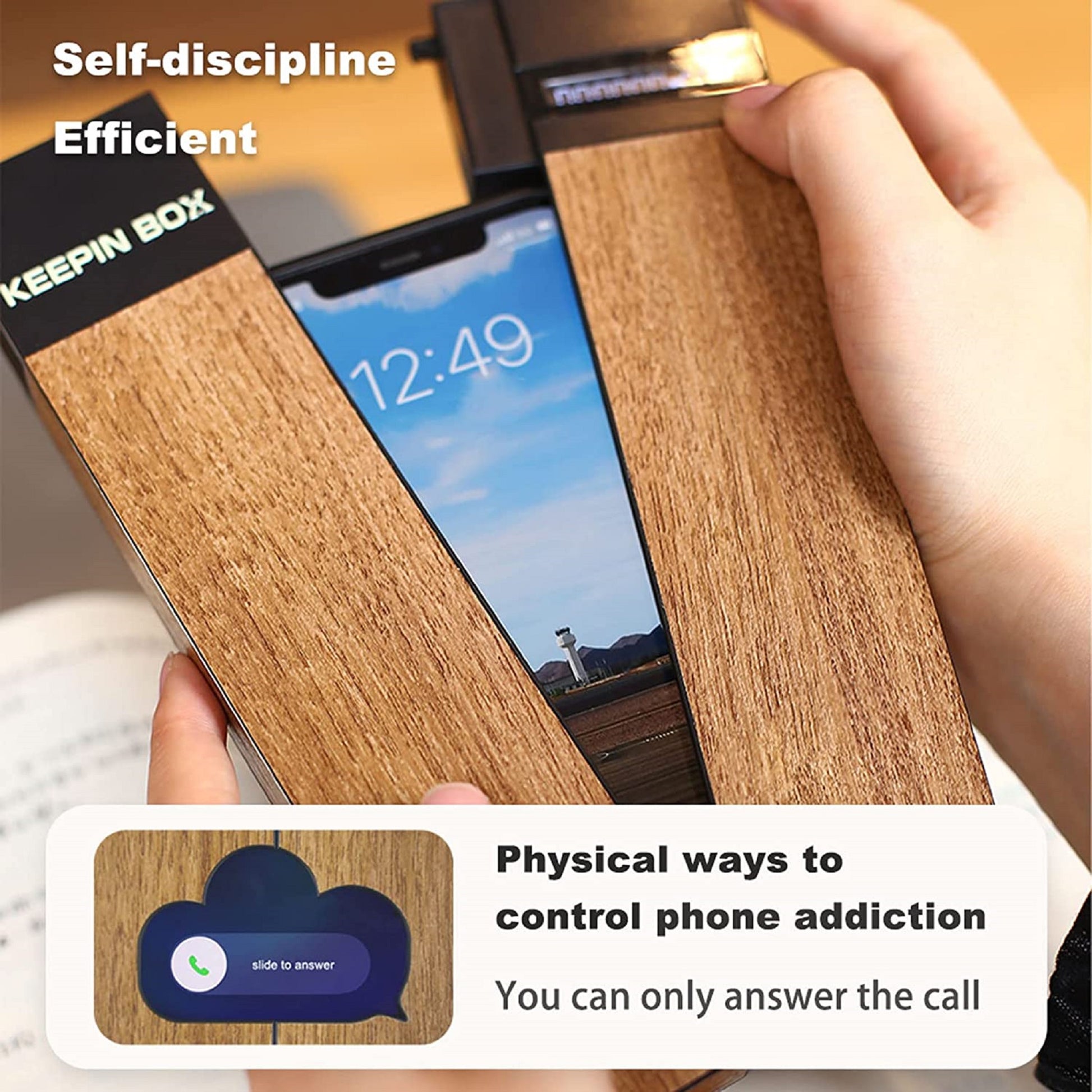 The phone timer lock box is constructed of ABS plastic, not wood; it uses true 3D wood grain film, which is delicate and pleasant to the touch; it lacks exterior screws, making it more difficult to break and sturdier. The internal size of the phone lock box with charger is about 6.57 x 3.54 x 0.51inch and is compatible with iPhone 13/13 Pro/13Pro Max/12/11/X/XR/XS/8/7/6 plus, Samsung, Motorola, Huawei, and other mobile phones.