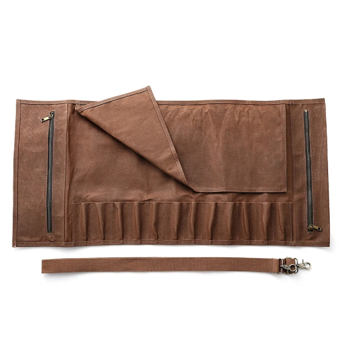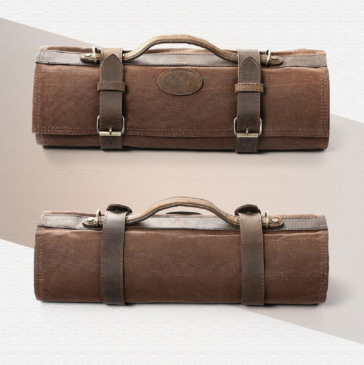 Crafted from 16oz oil-waxed canvas and Crazy-Horse leather, this knife roll bag exudes elegance and resilience. Its durable material resists abrasion, tears, and punctures, ensuring your tools are protected at all times. Featuring high-quality alloy metal buckles, sturdy stitching, and reinforced fasteners, this bag is built to withstand the toughest kitchen environments while maintaining its vintage charm.